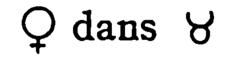 Vénus dans le Taureau, qui est son domicile, fait la personne, enjouée, sympathique, aimante, voluptueuse, bavarde, amie du plaisir, ayant beaucoup d’amis ; elle cause aussi, placée dans ce signe, un mariage heureux et prompt à moins que Mars, Saturne, Uranus ou Neptune, ne viennent empêcher la chose par un rayon défavorable; l’aspect de Jupiter ne pronostique qu’une générosité excessive.