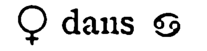 Vénus placée dans le signe du Cancer, dénote inconstance dans les affections et mariage du sujet avec une personne plus Âgée que lui, ainsi que privation de postérité à moins d’un bon aspect de Jupiter, de Mercure ou de la Lune. Vénus également dans ce signe signifie désaccord ou séparation, dans le mariage, danger couru à propos d’amour. Lorsque le signe du Cancer se trouve placé dans la XIème ou la Vème maison du thème, il y aura présage de nombreux enfants.