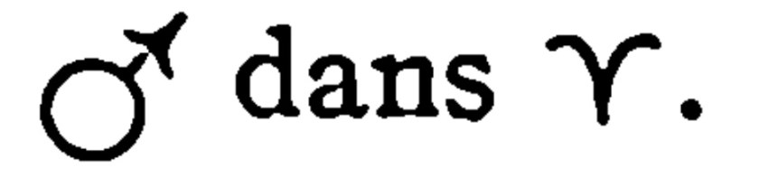 Mars placé dans le signe du Bélier, rend le sujet hardi, déterminé, audacieux et généralement entêté, enclin à la colère et à la dispute, toujours prêt à combattre pour la justice. Mars dans ce signe, donne le goût des travaux mécaniques et y fait réussir. Configuré avec Jupiter il indique que le sujet deviendra son propre maître coûte que coûte, supportant mal d’obéir aux autres ; il donne aussi, par cette configuration, le goût du jeu et des spéculations. Mars en aspect avec Saturne donne, dans ce signe zodiacal, un caractère vindicatif et la mémoire des injures reçues ainsi que la prudence ; en aspect avec Uranus ou Neptune, il incline à l’étude, l’entêtement, à la réserve et à la recherche des inventions.