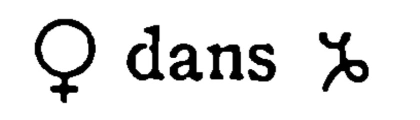 Dans le Capricorne, Vénus contracte une mauvaise influence sur le mariage; elle y cause des amours ou des relations dangereuses, le divorce ou la séparation, la stérilité. Ces significations mauvaises sont encore accrues par les configurations malignes de Mars, de Saturne, ou d’Uranus. Jupiter seul peut y apporter quelque adoucissement.