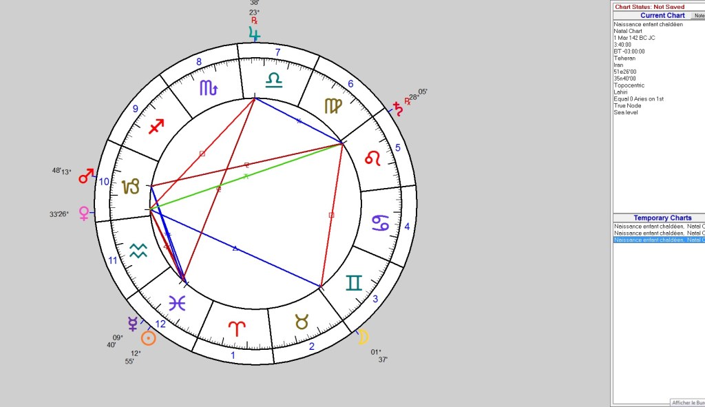 Thème sans les trans saturniennes. Pas d'ascendant, Zodiaque sidéral Lahiri. Je l'ai fait naître à Téhéran en Iran actuelle. 1 Mars 142 avant Jesus Christ à 3h40 avec le fuseau horaire actuel de Baghdad (+3h que le méridien de Greenwich).